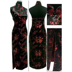 Women's Satin Chinese Dress Halter Backless Floral Long Prom Party Gown
