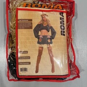 5-piece scarecrow outfit by Roma. Includes top, shorts, hat, and more. Features brown and black with fringe details.