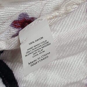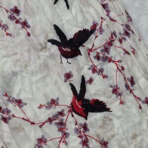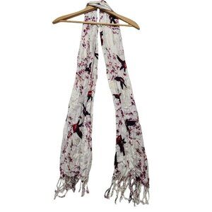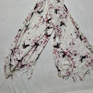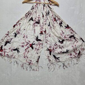 Womens Scarf Shawl Wrap White Floral with Red Black Birds Tassels Rayon