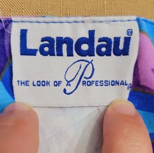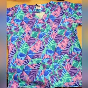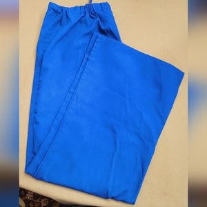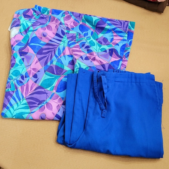 Womens size medium scrub top and size small petite scrub pants. Selling as a set. The scrub top is Landau brand and is in great used condition, other than the tag being worn. The scrub top has two lower front pockets, with each pocket having two sections. The pants are White Swan Fundamentals brand and are size small petite with a flared bottom and a small side slit. The pants show some slight wear but are in overall good condition.