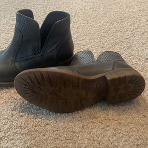 Nappa leather hand-burnished to a vintage patina, this ankle “re-boot” features unique embossed trim that evokes scales with a touch of western detailing. Modern cut-out styling finished with bound leather trim gives it a polished look and provides easy slip-on entry. Stacked rubber outsole for comfort. Imported in Black. Women’s Sizes: 6-10, including ½ sizes. Runs narrow and small so please size up ½ size. Used. Looks more dark grey. Offers encouraged!
