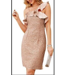 Women's Sequin Dress One Shoulder Ruffle Rose Gold XL