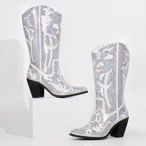 Women's Sequin Silver Fashion Western Zipper Pointed Toe Embroidered Boots