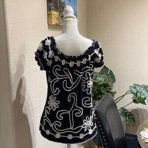 Cute black and white top for women’s casua or formal wear. I’m poshing due to size no longer fitting. It is still in great condition with no tears or anything.