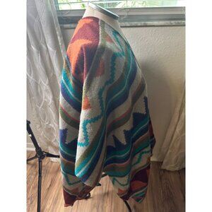 This poncho features a vibrant Southwestern pattern, crafted from a soft acrylic blend. Designed for versatility, it offers comfort and a stylish drape.