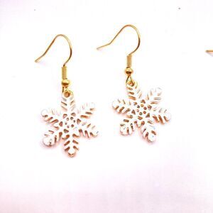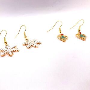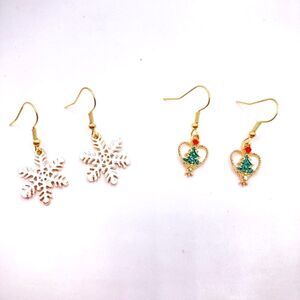 Costume/Fashion holiday themed Christmas jewelry Women’s female Two pairs of Christmas themed holiday dangle hook earrings. One pair of gold tone painted white snowflake dangle hook earrings and the other pair are gold tone heart shaped with Christmas tree center dangle hook earrings Approximately 1” in length New with tags