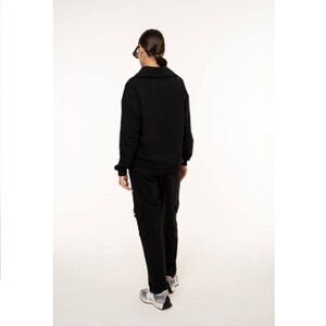 The black tracksuit is made of soft and pleasant to the touch 100% cotton. It retains its shape well after washing and