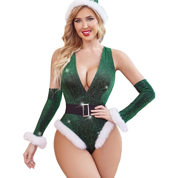 Women's Sexy Christmas Lingerie Green Bodysuit Deep V Teddy with Hat and Gloves