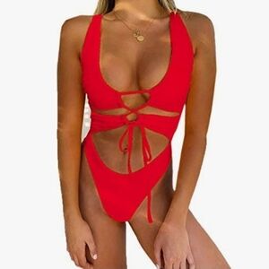 Dive into style with this vibrant red one-piece swimsuit, featuring a chic cut-out design and a high-cut leg for a flattering silhouette. The scoop neckline and tie details add a touch of elegance, making it perfect for poolside lounging or a day at the beach.