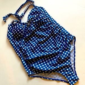 Womens Sexy One Piece Swimsuit Tie Back Blue Checkered Gingham Bikini Swimwear