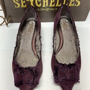 Elevate your shoe collection with these stunning Women's Seychelles Blackmail Burgundy Suede Kitten Heels. The pointed toe and slip-on closure make them easy to wear, while the fringe and bow accents add a touch of elegance. Perfect for any occasion, from parties to business meetings, these heels are a must-have for any fashion-forward woman. The low heel measures between 1-1.9 inches, providing comfort while still maintaining a stylish appearance. Available in size 8, these Seychelles Blackmail heels come with a box included.