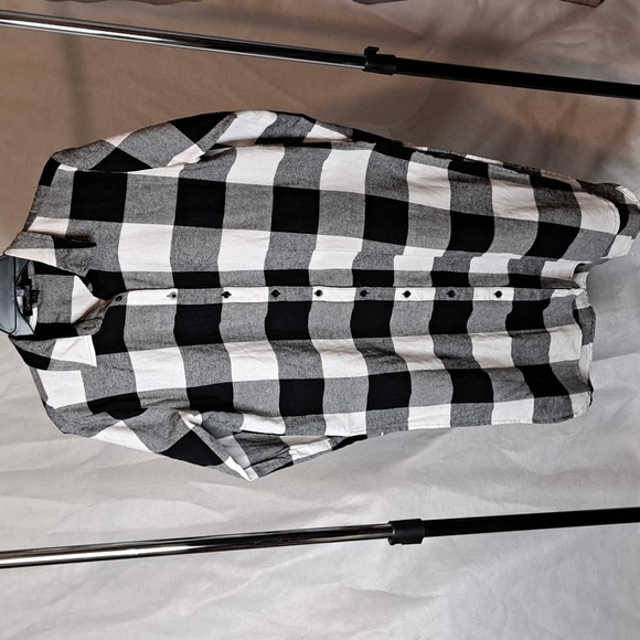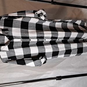 This black and white shacket would be great with jeans or shorts it has long sleeves but also have the buttons where you can roll up the sleeves and button them 100% cotton 21 inches from pit to pit 20 inches from pit to wrist 4 inches from top to bottom