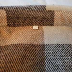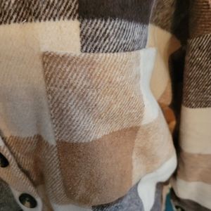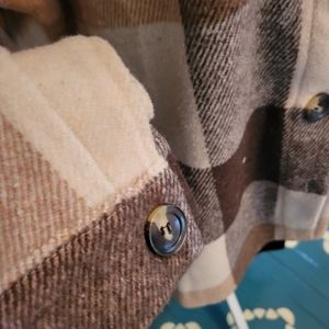 NWOT Unbranded women's shacket, brown,tan and wite in color. Ptp 23 and 27" long. Sz XL, shirttail hem 100% polyester but looks like wool blend