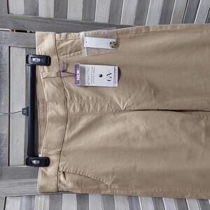 * Pulls on; trouser style with faux fly and elastic waistband; belt loops
