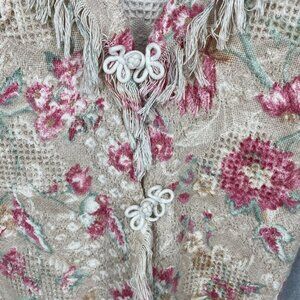 Womens Shawl Collar Floral Knit Jacket Size L Cottage Neutral Fringe Country