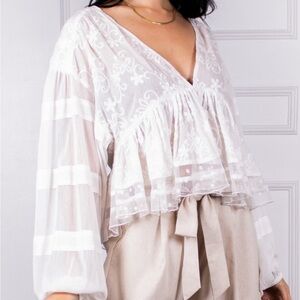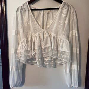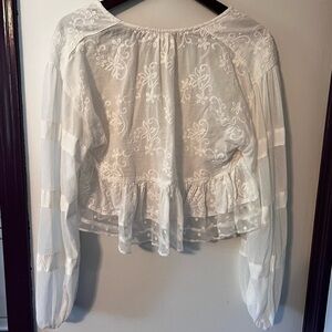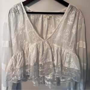 P.Cill Women’s Boho Top. Small. White mesh with floral details. Photo of me wearing it included. So beautiful, slowly, loose fitting. No stains, rips or tears.