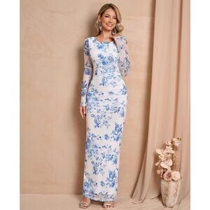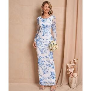 Womens Sheer Mesh Open Back Blue Floral Rose Print Maxi Cottagecore Wedding Guest Dress