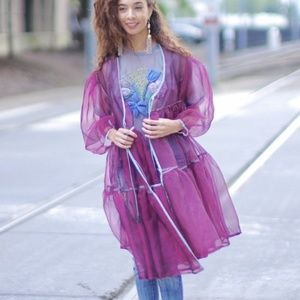 Elevate your style with this stunning sheer purple jacket. Perfect for layering and adding a pop of color to any outfit. The jacket is a deeper wine color in person even though it looks very purple in the photos.