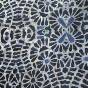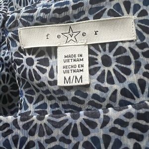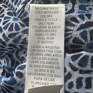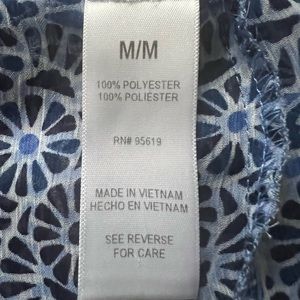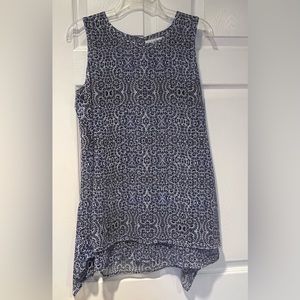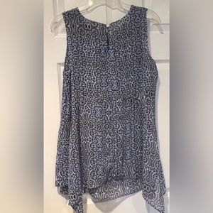 Women’s sleeveless, lightweight, blue, black and white pretty print tank with scarf hem. Single button closure in the back at the neckline. Excellent condition, stored in a smoke free home, machine wash/hand dry, 100% polyester.