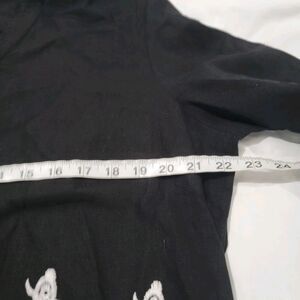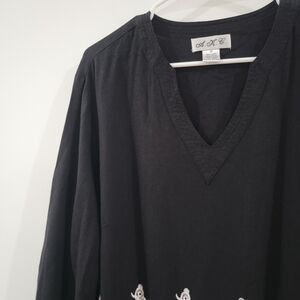 This women's shirt dress in size 1X is a luxurious linen blend with embroidered floral accents, giving it an old money elegance. The black dress features a V-neckline, long sleeves, and a pullover closure, making it perfect for various occasions including travel, casual outings, and business meetings. With a knee-length hem, this plus-size dress is both stylish and timeless, with a vintage flair that adds a touch of sophistication to any wardrobe.