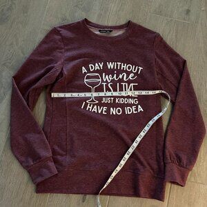 Offered is a women's Size Medium shirt with a saying about wine. Long sleeve. See pictures for measurements. The material is sweatshirt-like.