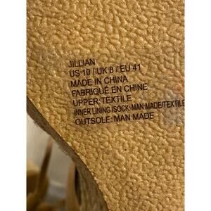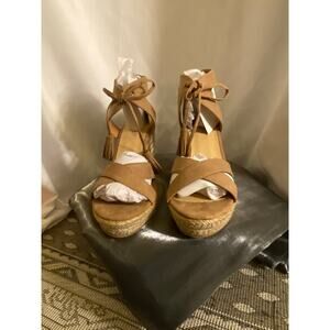 Women's Shoedazzle Wedge Sandals "Jillian" style. Size 10. Tan faux suede, two straps cross over the toes and ankle strap ties in front with lace and tassels. Platform wedge is covered in jute and is 4 inches tall at heel. NEW in Box, No issues. Box has storage damage...dented, torn corner. Again, No issues with the sandals.
