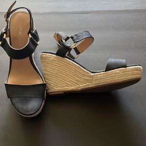 4" Wedge Heals by Merona. Size 8.5. This Shoe has Gold Hoops on each side of the shoe w/a Single Leather Strap Across The Toes & Ankles. Worn, Great Condition!