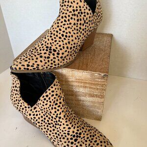Animal print with beige & black, pointed toes, zipper on instep, stack heel with 2 & 1/2 inch height.
