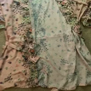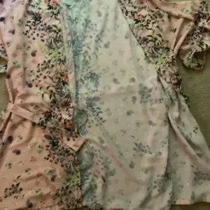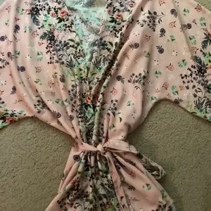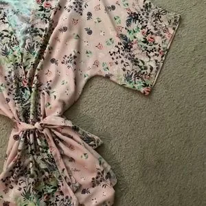 ~ For Sale: Designer Flora Nikrooz women's short bathrobe. Asian-inspired floral print wrap robe, 3/4 length sleeves, inside ties, outside belt loops, tie belt. Colour: pale pink; scattered floral print throughout, NO POCKETS. Perfect for those late spring-summer days. Can also be worn as a beach cover-up. Fiber content: 100% polyester, size medium. Laundering instructions: HAND WASH ONLY, COOL WATER, NO BLEACH, drip dry. Hardly worn, in EUC, robe has been laundered. ~