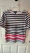 Karen Scott elbow length cuffed sleeve shirt, scoop neck. Excellent condition, size small. Blue and white striped with a bottom border of red, blue, white and teal stripes.