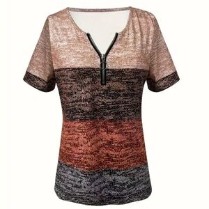 Stylish and comfortable, this striped V-neck top is perfect for any casual outing. Featuring a blend of black, brown, and cream colors, it pairs well with jeans or skirts for a chic look.