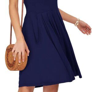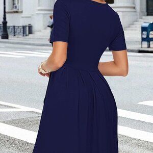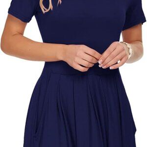 Women's Short Sleeve Summer Dress Pleated Loose Swing Knee Length Dresses with P