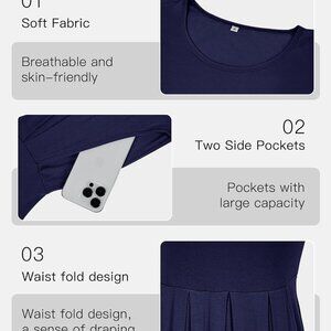 Features:Super Soft and Comfortable.Breathable and great to wear all day.Suitable Occasion: Casual/Party/Work/Beach/Holiday Style.Good for Spring,Autumn,and Summer.Loose Fit Casual Knee Length Tunic Dress,Plain Pleated Swing Party Dance Dress,Scoop Neck T-Shirt,Loose Dress With Pockets