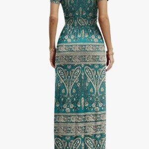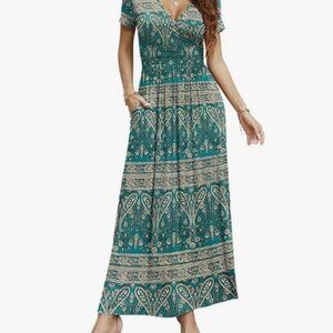 Women's Short Sleeve V-Neck Maxi Dress, Pleated Waist, Pockets