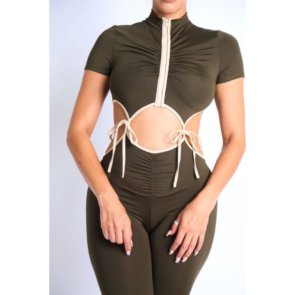 Women's Short Sleeves Zipper Front Tie Detailed Jumpsuit medium