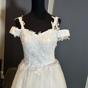 *This dress has a manufacturing flaw - an extra corset back loop! (See pictures) and has been worn and the left front of the off the shoulder strap needs to be sewn back on securely as stitching has come undone (see pictures). The corset loop is not much of an issue and cannot really even be seen under the bow. The shoulder strap does need repair to wear the dress. Priced lower to compensate for flaws. Great dress for the price if you are happy to sew a small area!