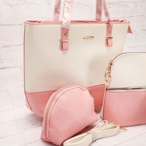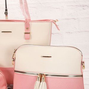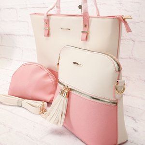 Women's Shoulder Tote Crossbody Bag & Pouch 3 Piece Set Medium Pink/Cream