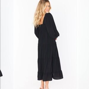 This stunning black sundress by Show Me Your MuMu features a smocked bodice and long sleeves, perfect for a cocktail night out. The square neckline adds a touch of elegance, while the smocked detailing ensures a flattering fit.