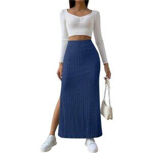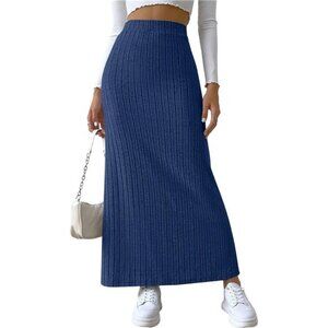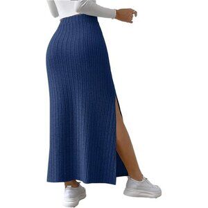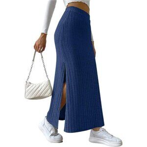 Women's Side Slit Ribbed Knit Bodycon Long Skirts Blue