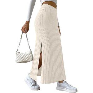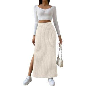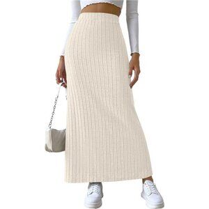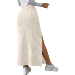 Women's Side Slit Ribbed Knit Bodycon Long Skirts Cream