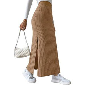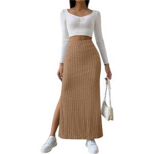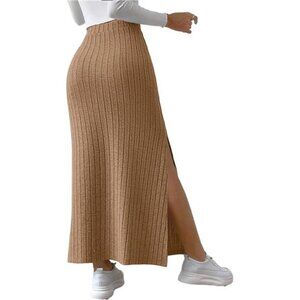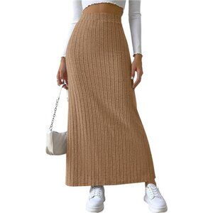Women's Side Slit Ribbed Knit Bodycon Long Skirts Khaki