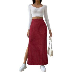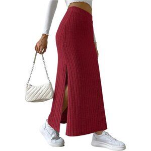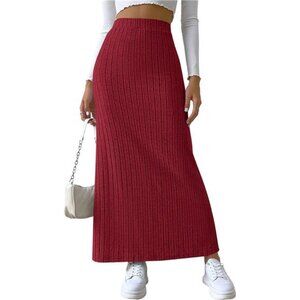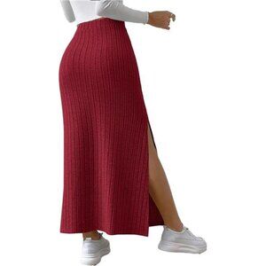 Women's Side Slit Ribbed Knit Bodycon Long Skirts Wine Red