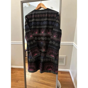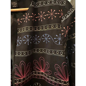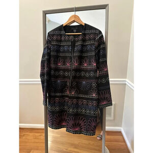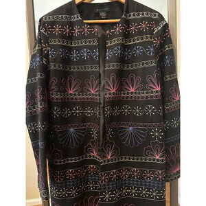 Silk Land embroidered jacket in black multi color, size L. Made from luxe silk with intricate embroidery, this piece features traditional elements and modern style.