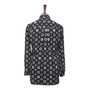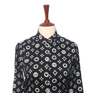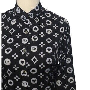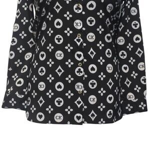 Discover a unique blend of modern design and classic elegance with this black and gray silky satin blouse, featuring a sophisticated geometric pattern interwoven with delicate floral motifs, hearts, diamonds, spades, and the iconic CK logo. This shirt perfectly balances bold graphics with refined details, creating a standout piece that’s both artistic and wearable.