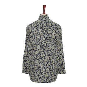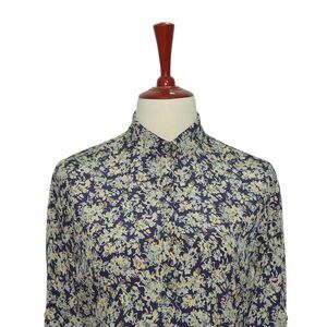 Womens Silky Satin Shirt Blue Green Floral Blouse Button Up Dressy Top Medium