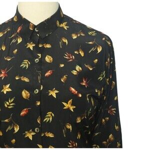 Womens Silky Shirt Button Up Black Floral Autumn Leaves Casual Party Tunic M