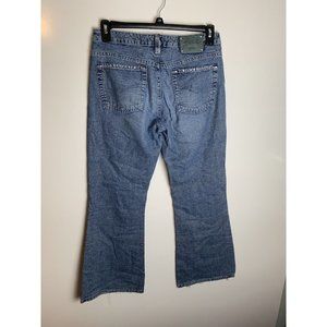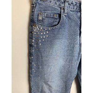 Womens Silver 30/31 Distressed Faded Button Fly Flare Blue Jeans Jewel. Has a couple missing stones. See pictures. Condition is "Pre-owned". Shipped with USPS Priority Mail.