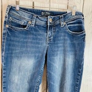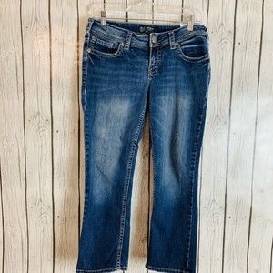 Womens Silver Aiko Rivets Flap Pocket Capri Denim Blue Jeans Sz W 30 L 22
