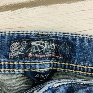 Description: Womens Silver Aiko Rivets Flap Pocket Capri Denim Blue Jeans