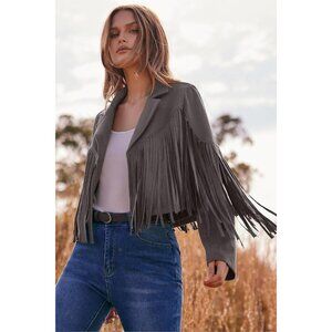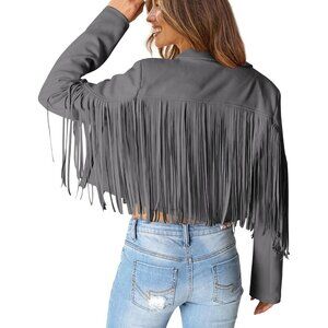 Women's Silver Grey Fringe Faux Suede Leather Tassel Motorcycle Cropped Jackets